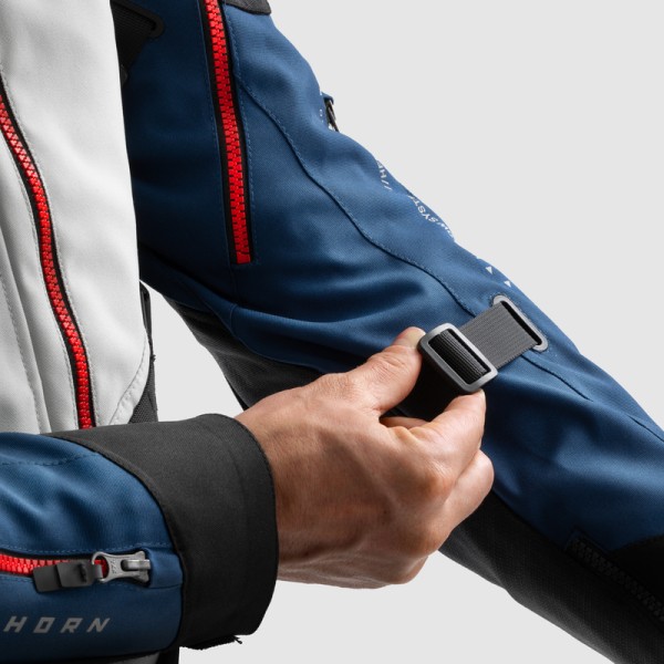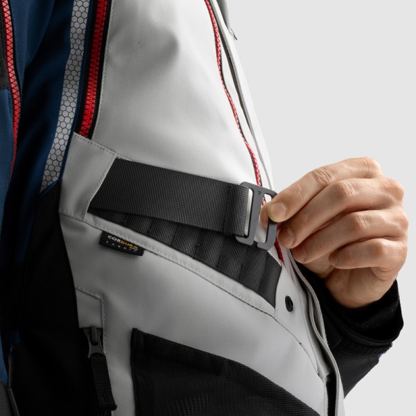 - wiele opcji regulacji: regulacja obwodów rękawa na przedramieniu i bicepsie, regulacja obwodu korpusu w talii, regulacja dopasowania ochraniacza pleców, możliwość zwiększenia obwodu bioder dzięki rozpinanemu klinowi, regulacja obwodu kołnierza i mankietów,